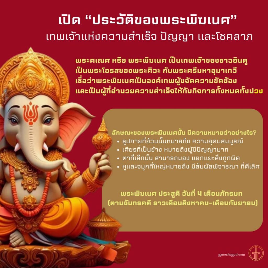 พระพิฆเนศประวัติพระพิฆเนศ หรือที่หลายคนรู้จักกันในนาม “เทพเจ้าแห่งการขจัดอุปสรรค” สีกายสีแดง (บางแห่งว่าผิวเหลือง นุ่งห่มแดง)
