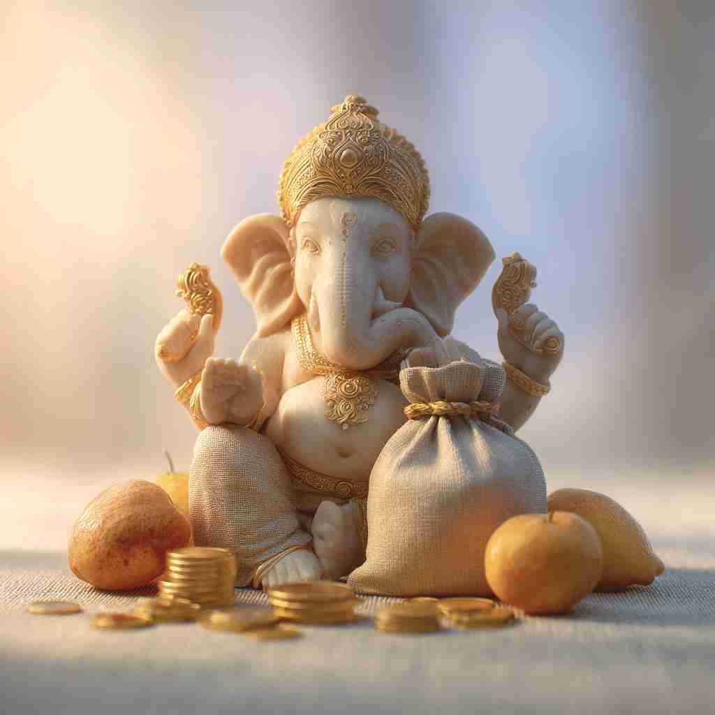 ปางนี้มักแสดงให้พระพิฆเนศถือถุงเงิน เหรียญทอง ผลไม้มงคล หรือขนมโมทกะ (Modaka) ที่เปรียบเสมือนขุมทรัพย์แห่งความมั่งคั่ง โชคลาภ ทรัพย์สินและความอุดมสมบูรณ์ จุดเด่นคือดึงดูดเงินทอง เพิ่มรายได้ เสริมเสน่ห์ด้านการค้า เหมาะกับพ่อค้า นักธุรกิจ หรือผู้ที่ต้องการความมั่นคงทางการเงิน